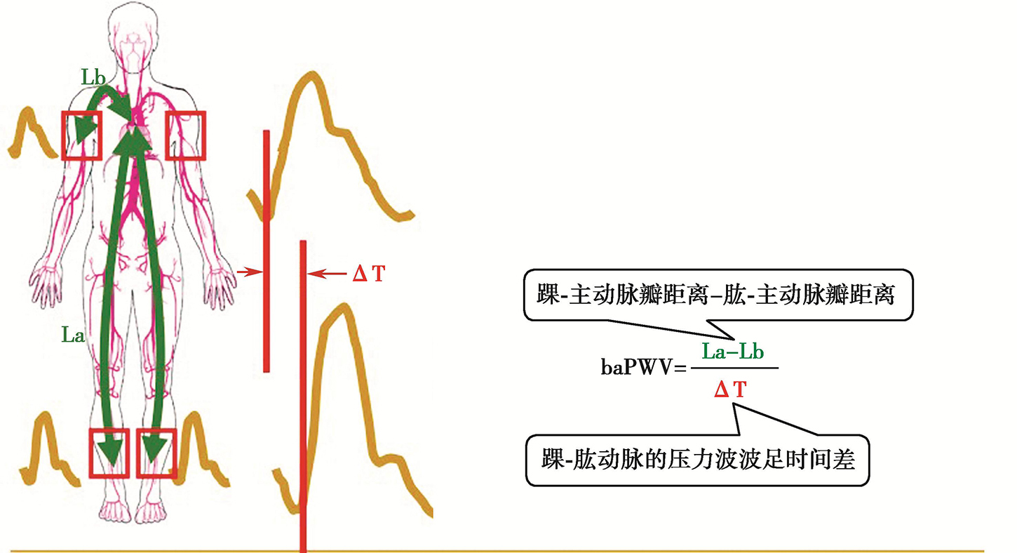baPWV=(踝-主动脉瓣距离-肱-主动脉瓣距离)/踝肱动脉的压力波波足时间差。主动脉根部与测量点间的血管距离按身高通过固定函数式推算,踝肱动脉的压力波用袖带示波法采集,根据特征点自动识别波足。