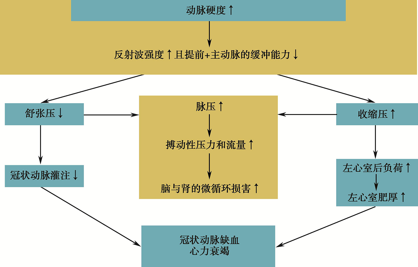 血流从左室射入主动脉产生压力波,传播至全身动脉树分支。在压力传输中这种前向压力波在任何结构和功能不连续的动脉树节点上均可被反射,返回升主动脉,因此,前向波和反射波沿着动脉树始终互相作用。年轻人在生理条件下,动脉硬度低,压力波传播的速度较慢,反射波落在升主动脉压力波的舒张期。由于衰老、高血压、动脉粥样硬化等因素影响,动脉硬度不断增加,PWV加快,压力波往返远端反射点与主动脉瓣所需时间缩短,反射波提前落在主动脉根部压力波的收缩期而不是舒张期,导致收缩期压增加而舒张期压下降。这种左室射血与血管硬度不匹配的病理生理改变,导致左室肥厚且舒张期冠状动脉灌注压降低,进而增加心血管危险。已有许多临床研究发现,PWV和压力波反射为心脏事件的独立危险因子,为以上病理生理机制提供了有力的证据。与年龄俱增的动脉僵硬度增加导致的脑与肾血管损伤不能用压力波反射理论来解释,而主要是大动脉僵硬后流入脑与肾的血流搏动性和流量更大,高搏动性压力和流量引发的径向牵拉和剪切力增大,导致动脉壁中层断裂,血管内皮损伤,血栓、梗死和微血管瘤形成。通过降低血压,提高主动脉和肌性动脉顺应性,可能降低这种损害。以上是目前对动脉僵硬度与压力波反射病理生理意义的认识(图2-5)。