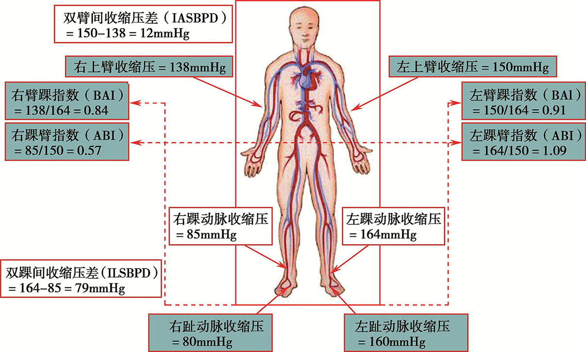 下肢动脉病(lower extremity artery disease,LEAD)主要指下肢动脉的狭窄、阻塞性病变,在老年人群中相当常见,也是动脉粥样硬化最常累及的血管,且与心血管风险密切相关。四肢血压测量最先用于研究LEAD,ABI(图2-2)已广泛用于LEAD的诊断以及心血管风险评估。一般情况下,由于脉搏波放大可引起下肢动脉收缩压较上肢高10~15mmHg,欧洲心脏病学会(European Society of Cardiology,ESC)指南推荐:ABI 1.0~1.39为正常范围,0.91~0.99为可疑狭窄,≤ 0.90可诊断LEAD。ABI值与LEAD严重程度相关,0.40~0.90提示存在重度狭窄,≤ 0.4提示严重缺血。当ABI用作评估周围动脉疾病患者的诊断工具时,应分别报告两侧下肢的ABI;当ABI用作心血管事件和死亡率的预后标志物时,选较低一侧的ABI。ABI≥1.40代表动脉不可压缩,另外在双侧上肢动脉严重狭窄或主动脉瓣重度反流患者中也可出现。