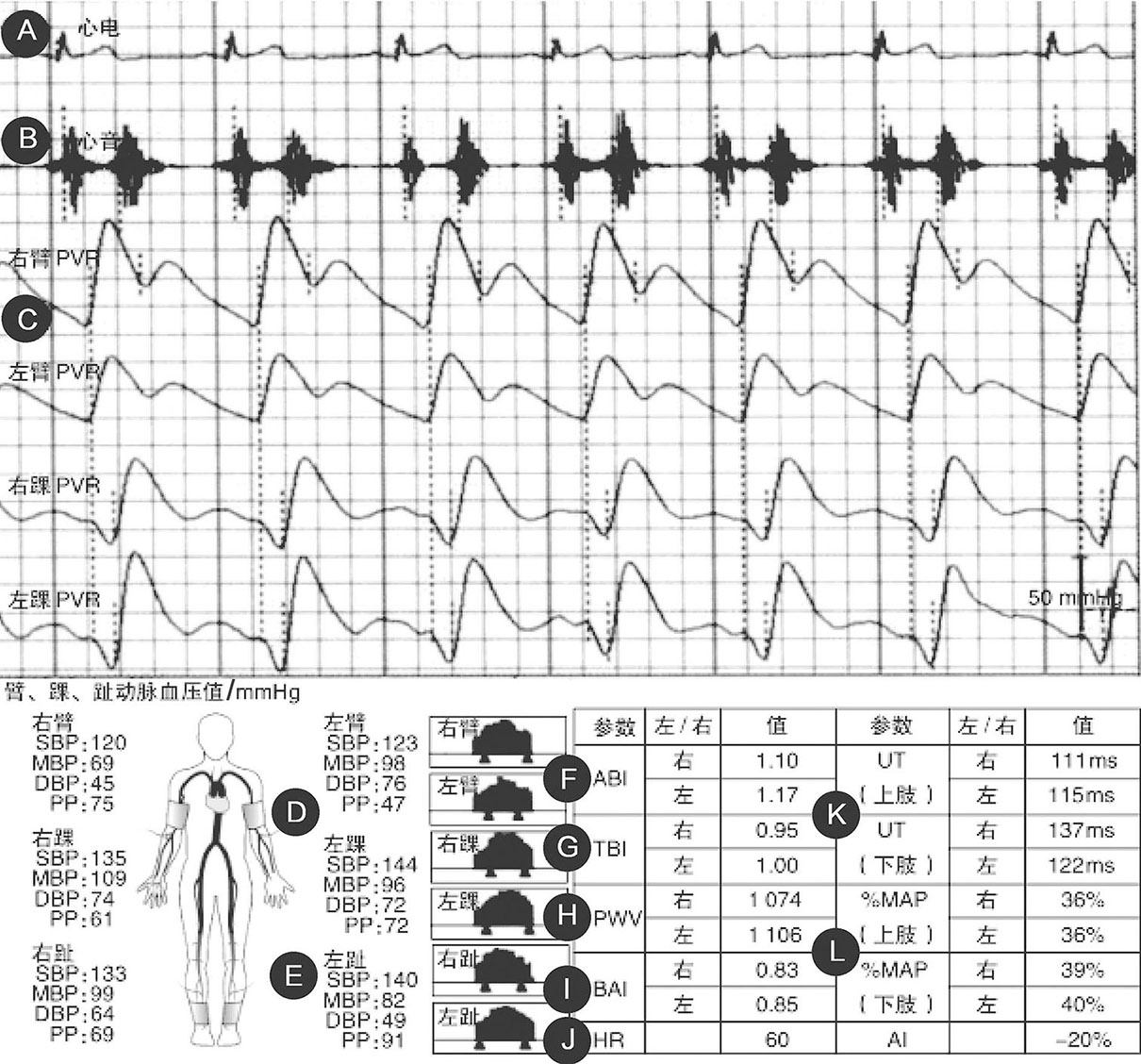 A.心电图(ECG);B.心音图(PCG);C.脉搏容积图(PVR);D.四肢动脉血压测量值;E.趾动脉血压测量值;F.踝臂指数(ABI);G.趾臂指数(TBI);H.臂踝脉搏波传导速度(baPWV);I.臂踝指数(BAI);J.心率(HR);K.脉搏波上行时间(UT);L.平均动脉压百分比(%MAP)。其中,PVR、四肢动脉血压测量值、ABI、baPWV、UT、%MAP系临床常用参数。