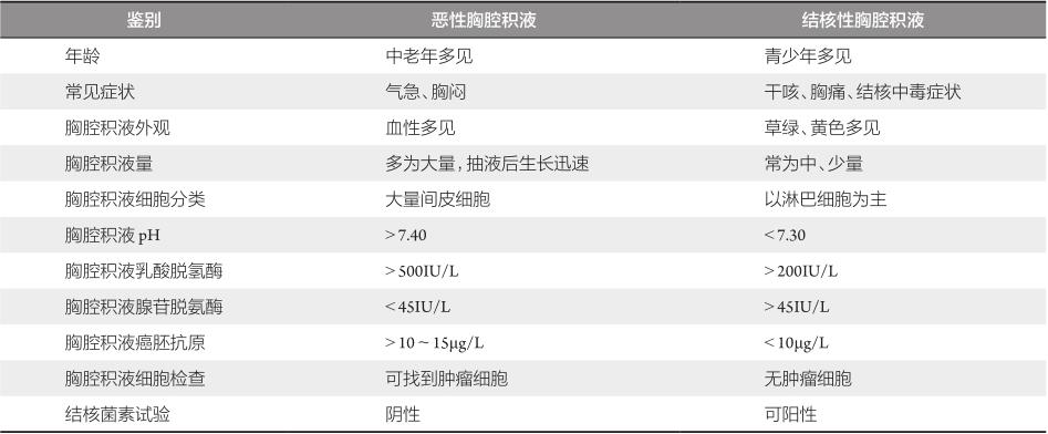 恶性胸腔积液常继发于肺癌(腺癌居多)、乳腺癌等。处理恶性胸腔积液时,应尽可能抽尽胸液,并向胸腔内注入抗癌药物(如顺铂、阿霉素、丝裂霉素、氟尿嘧啶、博来霉素等),生物免疫抑制剂(白细胞介素-2、干扰素等),或胸膜粘连剂(滑石粉、四环素、多西环素等)。恶性胸腔积液常为大量,反复抽液可使蛋白丢失太多,应注意全身支持治疗。在局部处理胸腔积液的同时,应针对不同肿瘤酌情进行全身治疗(化疗、靶向治疗、放疗等)。