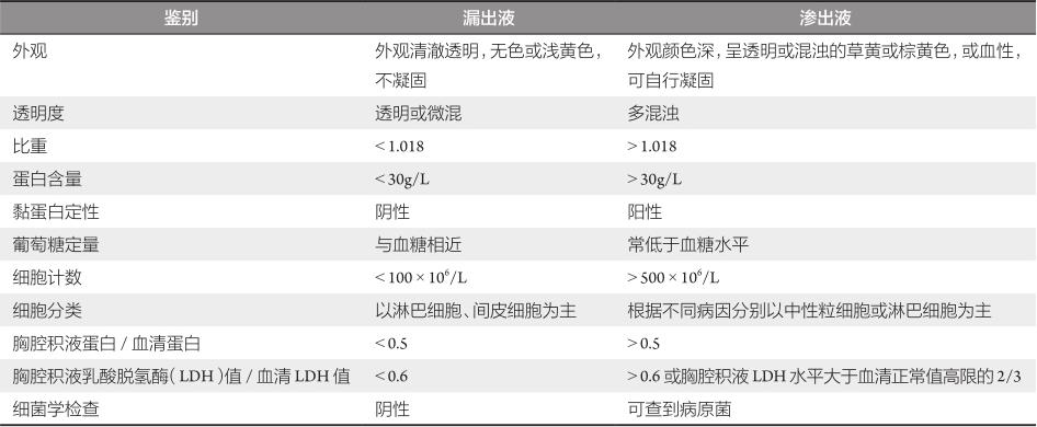 注:根据外观、比重、蛋白含量和细胞数诊断的敏感性和特异性较差,目前多根据Light标准。①胸液中总蛋白/血清总蛋白> 0.5;②胸液中LDH/血清LDH > 0.6;③胸液中LDH大于血清正常值高限的2/3。符合上述标准中任何1条可诊断为渗出液。有些积液难以确切地划入漏出液或渗出液,见于恶性胸腔积液,系由于多种机制参与积液的形成。
