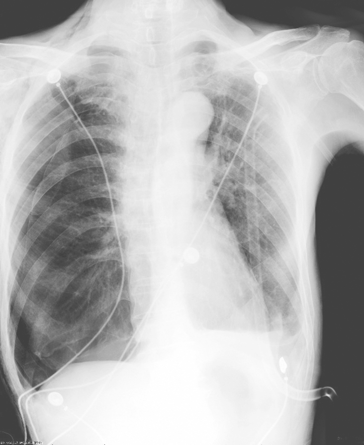 是诊断气胸的重要方法,也是监测治疗效果的重要手段。典型的气胸X线检查可见肺组织向肺门方向压缩,边缘呈外凸弧形的细线条形影,称气胸线。气胸线以外透亮度增强,无肺纹理可见,气胸线以内透亮度降低,为被压缩的肺组织(图2-13-6)。大量胸腔积气时,肺组织被压向肺门,呈团块状,外缘呈弧形或分叶状,并可出现纵隔及心脏向健侧移位。气胸量的多少可根据后前位X线胸片判断。侧胸壁至肺边缘的距离为1cm时,约占单侧胸腔容量的25%,2cm时约占50%。故侧胸壁与肺边缘的距离≥2cm为大量气胸,< 2cm为小量气胸。如从肺尖气胸线至胸腔顶部估计气胸大小,距离≥3cm为大量气胸,< 3cm为小量气胸。