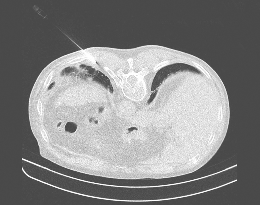 经皮闭式胸膜活检对胸腔积液病因诊断有重要意义,胸膜针刺活检具有简单、易行、损伤性较小的优点,诊断阳性率为40%~75%。CT或超声引导下活检可提高成功率,研究显示CT或超声引导下的胸膜活检(图2-13-4)对恶性胸膜疾病诊断的敏感性达70%~91%。