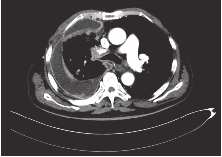 通过CT检查少量的胸腔积液亦能显影。CT的优点还包括通过病灶密度观察可将局限包裹性积液与肺实质病变加以鉴别;强化造影后可较好地显示纵隔、肺门、气管旁淋巴结、肺内肿块及胸膜病变等(图2-13-3)。