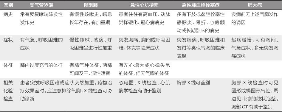 气胸主要与支气管哮喘和慢阻肺、急性心肌梗死、急性肺血栓栓塞症、肺大疱等相鉴别(表2-13-2)。