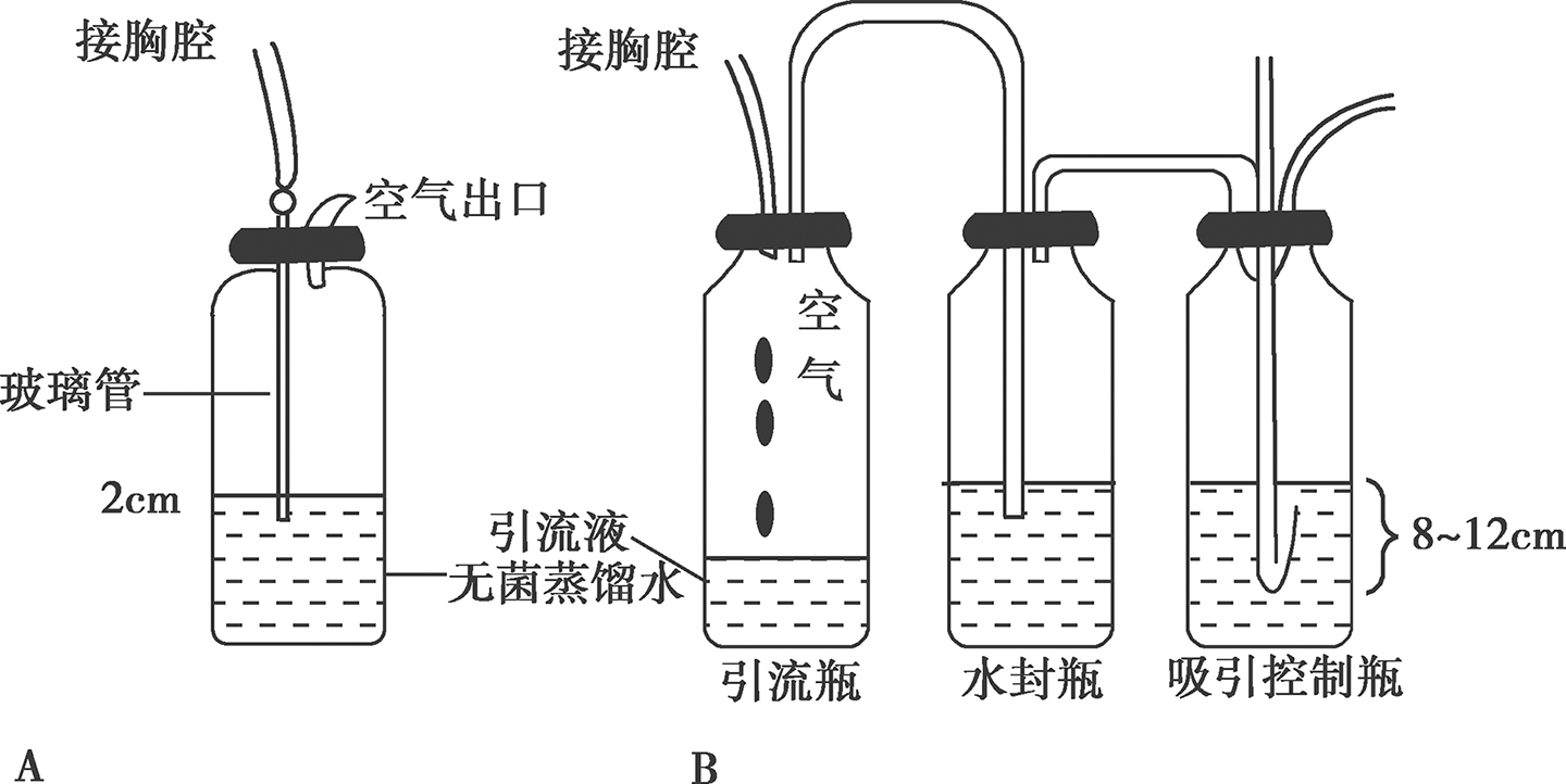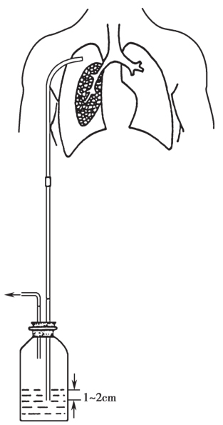 适用于胸腔穿刺抽气效果不佳的交通性气胸、张力性气胸和部分心肺功能较差而症状较重的闭合性气胸患者。插管部位通常选择患侧锁骨中线第2肋间或腋前线4~5肋间,局限性气胸或有胸膜粘连者,应在X线或CT定位下确定最佳插管部位。常规消毒、局麻后,沿肋骨上缘切开皮肤后,经钝性分离肋间组织达胸膜,用套管针刺入胸膜腔,拔出针芯,通过套管将灭菌胶管插入胸腔,导管固定后,另一端置于水封瓶的水面下1~2cm(图2-13-8),使胸膜腔内压力保持在1~2cmH 2 O以下,插管成功则导管持续逸出气泡,呼吸困难迅速缓解,压缩的肺可在几小时至数天内复张。对肺压缩严重,时间较长的患者,插管后应夹住引流管分次引流,避免胸腔内压力骤降产生肺复张后肺水肿。如未见气泡逸出1~2d,患者气急症状消失,经X线或CT见肺已全部复张时,可以拔除导管。若经水封瓶引流后未能使胸膜破口愈合,肺持久不能复张,可在引流管加用负压吸引装置(图2-13-9)。