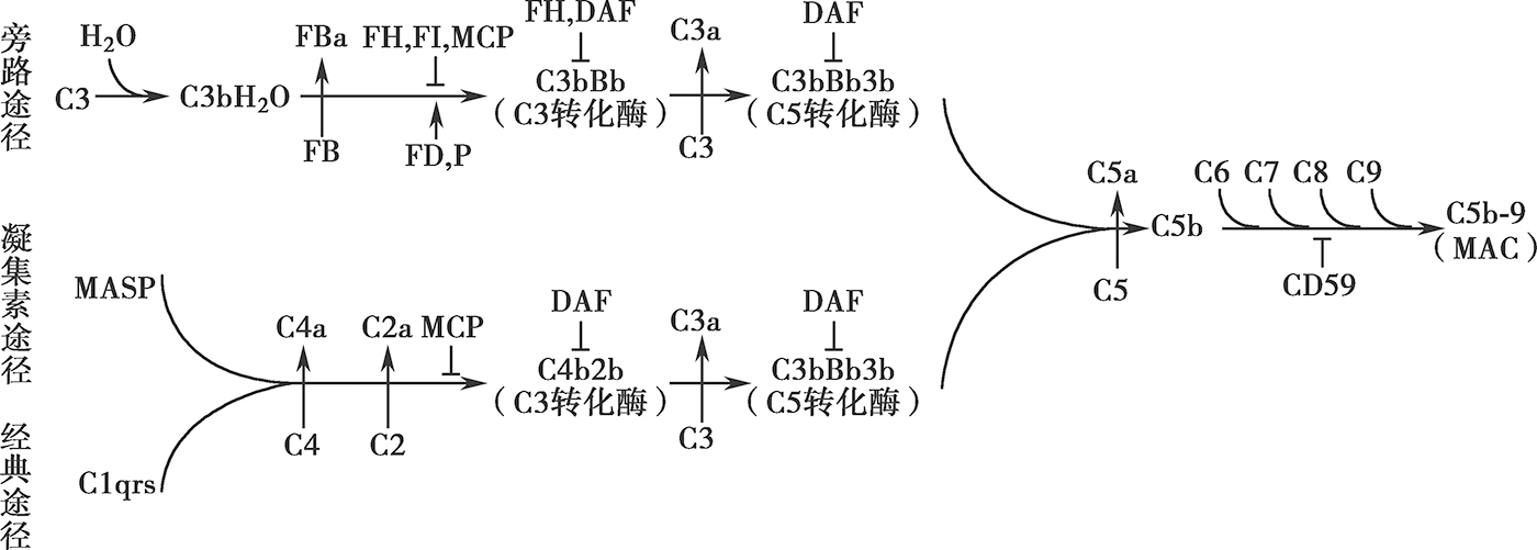 注:MASP,凝集素相关丝氨酸蛋白酶;FB,B因子;FH,H因子;FI,I因子;MCP,膜辅因子蛋白;DAF,衰变加速因子;MAC,膜攻击复合物。