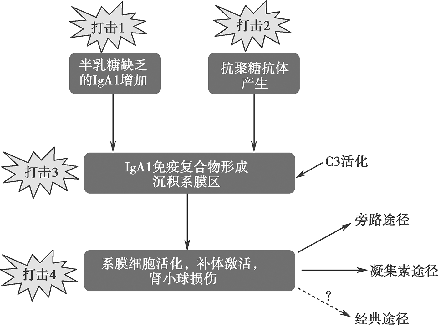 补体激活作为一把“双刃剑”,在宿主防御中发挥不可或缺的作用,但同时也能介导免疫损伤。经典的多重打击模型认为(图6-2-2),异常的半乳糖缺乏IgA1(galactose-deficient IgA1,Gd-IgA1)水平增加导致第一重打击。增加的Gd-IgA1引起自免疫反应导致抗聚糖抗体的产生,此为第二重打击。增加的Gd-IgA1及抗聚糖抗体形成免疫复合物沉积于肾小球系膜区,此为第三重打击。沉积下来的免疫复合物激活补体途径、刺激系膜细胞增生、导致细胞因子、趋化因子及细胞外基质蛋白释放增加,从而导致炎症及纤维化,这是第四重打击。而系膜细胞在补体激活中起主要作用,主要通过旁路和凝集素途径激活补体系统。