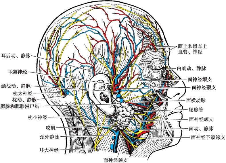 分布于头面部浅层的主要动脉为面动脉,面静脉与其伴行(图1-64)。