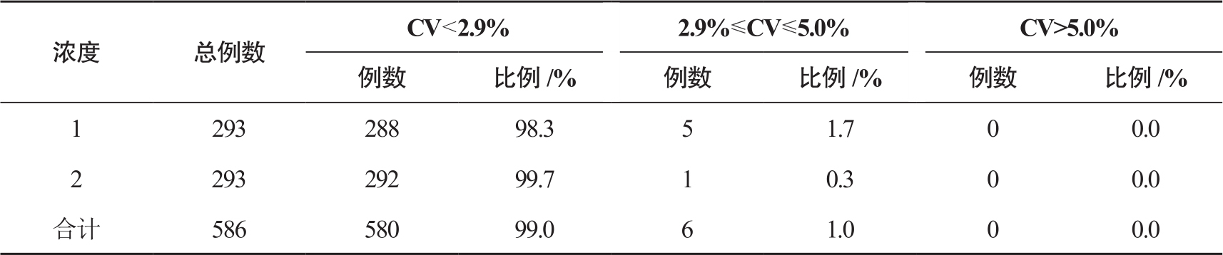 监测点实验室血糖检测开始后,进行每日血糖检测质控。将各监测点在性能验证阶段累积的中间精密度检测数据作为日常检测时各浓度判断质控数据的靶值和标准差。每个检测工作日均进行质控,正式检测调查样本前先做一次两个浓度水平的质控样本,质控结果满意后开始检测调查样本;当天全部检测工作结束后再进行一次质控检测。分析每日室内质控测定的数据,共计上传室内质控数据5 596个,监控软件判断为失控的有142个,已上传数据的监测点实验室总体血糖检测室内质控失控率为2.5%(142/5 569);根据美国国家临床生化学院(NACB)关于糖尿病实验室诊断临床要求血糖检测精密度CV<2.9%的分析标准,两个浓度水平(低、高)血糖检测室内质控CV<2.9%的实验室占监测点实验室总数的比例分别为98.3%、99.7%,平均为99.0%。各监测点每日室内质控测定CV值分布情况见表1-1。