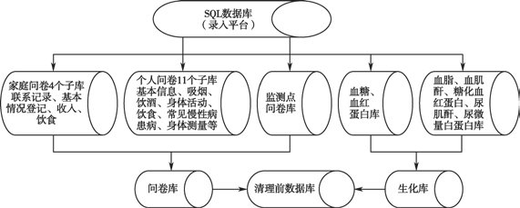 本次监测数据经在线数据管理平台录入,并利用SQL数据库进行管理(图1-2)。根据监测内容,监测数据可分为家庭问卷信息(90个变量)、个人问卷和身体测量信息(489个变量)、监测点区域问卷信息(29个变量)、血糖和血红蛋白相关数据(27个变量),以及血脂、糖化血红蛋白、血肌酐、尿肌酐、尿微量白蛋白等数据(17个变量)。其中,家庭问卷和个人问卷根据具体调查内容可细分为多个子数据库。各数据库通过个人编码、采血编码和家庭户编码进行关联合并。