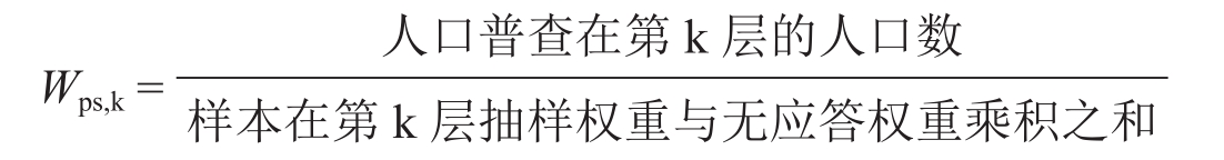将用抽样权重和无应答权重加权的监测样本与全国第六次人口普查人口数均按照上述因素进行分层后,每层事后分层权重 W ps,k 的计算如下:
