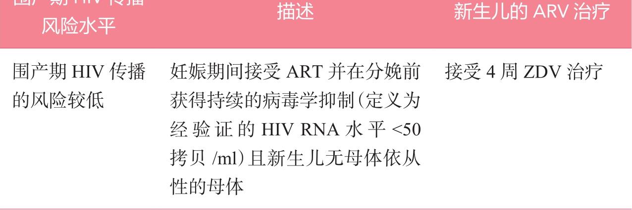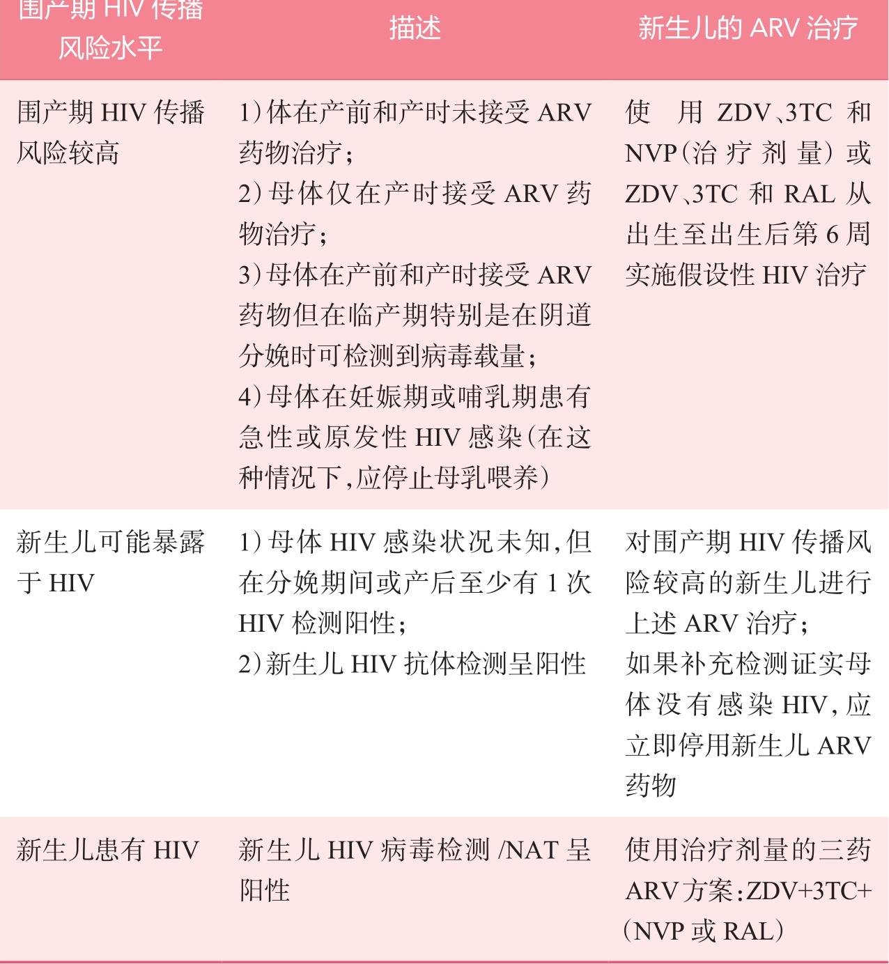 美国DHHS指南根据新生儿不同的围产期HIV暴露风险,推荐HIV暴露新生儿预防性用药见表2-1。