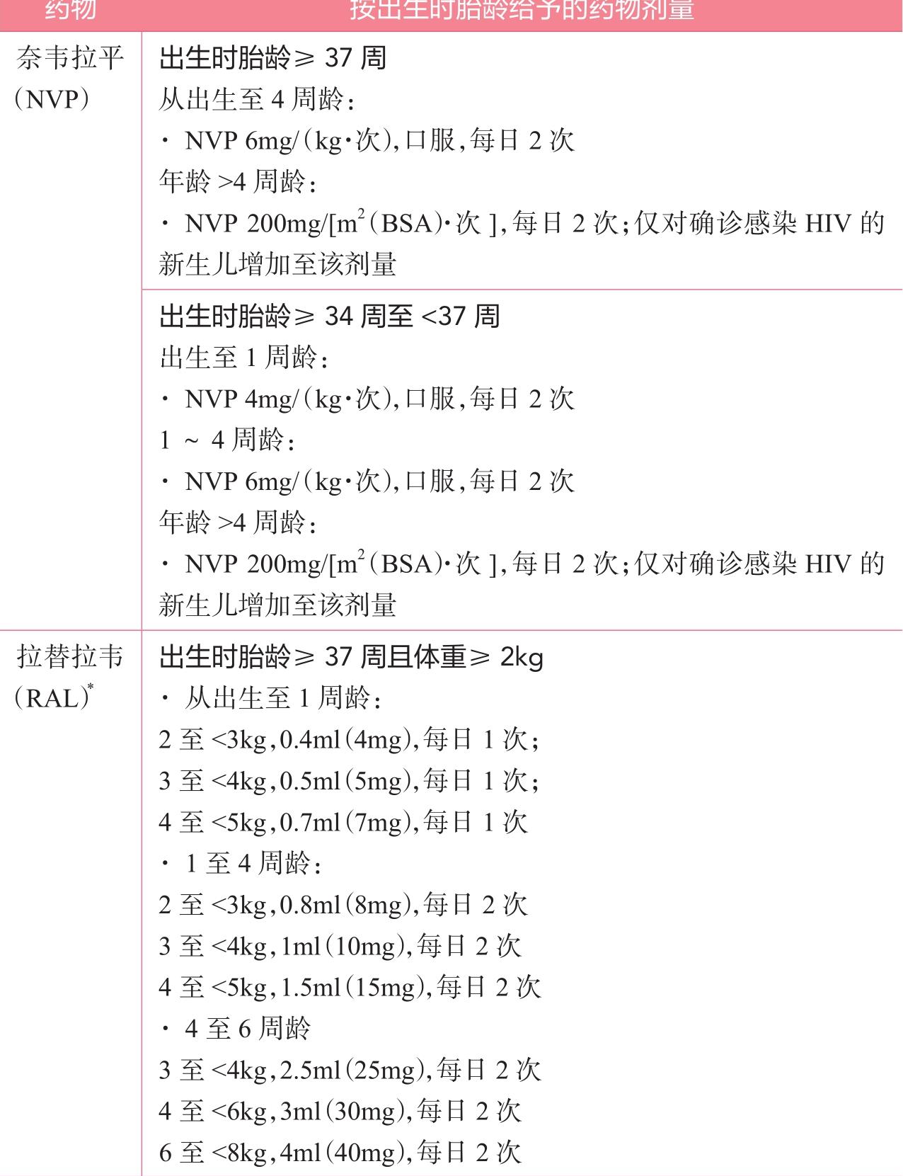 * 如果母体在分娩前2~24小时服用了RAL,新生儿的首次RAL给药应延迟至出生后24~48小时;应尽快开始额外的ARV药物治疗
