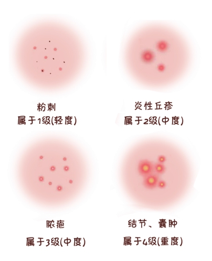 青春痘的分级体现了青春痘的严重程度,确定其分级是选择采用哪种治疗手段的依据,如果仅有粉刺,属于1级(轻度);如果有炎性丘疹,属于2级(中度);如果有脓疱,属于3级(中度);如果有结节、囊肿,则属于4级(重度)。