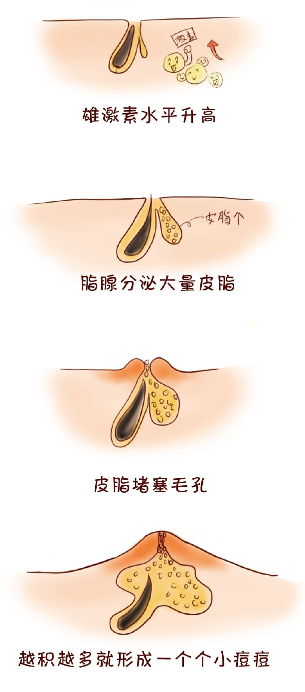 要想治疗青春痘,我们首先要了解一下为什么青春期的男生女生容易长痘痘。青春期时,体内的雄激素水平升高,雄激素促进皮脂腺分泌大量皮脂,皮脂堵塞毛孔,皮脂越积越多就形成了一个个青春痘。如果毛囊皮脂腺导管的角化异常,可造成皮脂进一步堵塞,加重病情。另外,皮脂堵塞毛孔容易引发细菌滋生,尤其是痤疮丙酸杆菌大量繁殖可导致炎症加重,使病情进一步发展。所以,青春痘的发生主要与激素分泌失衡、皮脂分泌过多、毛囊皮脂腺导管堵塞、细菌感染和炎症反应等因素密切相关。