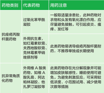 需要注意的是: 在应用外用药物之前要洗净患处,并轻轻擦干,待干燥后于患处局部涂一薄层外用药物。应用外用药物时可小范围试用,以减少刺激反应,如果刺激反应严重应停药。通常外用维A酸类药物有轻微的局部刺激作用,当与其他具有刺激性的药物同时使用时可导致额外的刺激反应。因此,可采取清晨使用其他皮肤用抗痤疮药如红霉素软膏、克林霉素洗剂或过氧化苯甲酰水性凝胶,晚上使用外用维A酸类药物的方式,以避免药物刺激作用。