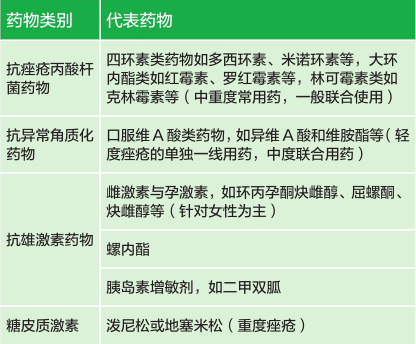 但对于中重度及重度痤疮,单纯使用外用药物治疗是不够的,通常需要口服药物联合外用药物治疗,因为多种药物联用可以覆盖痤疮发病机制的更多环节,产生协同的治疗作用。其治疗方案较为复杂,应去正规医院在医生的指导下联合用药。常见的口服药物见下表。