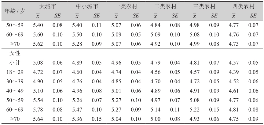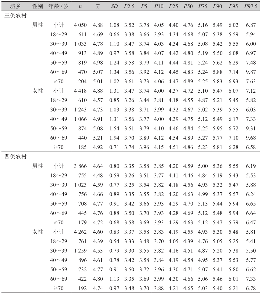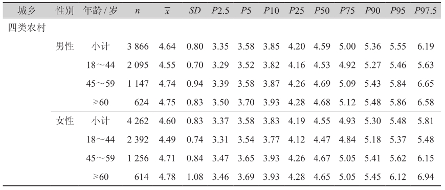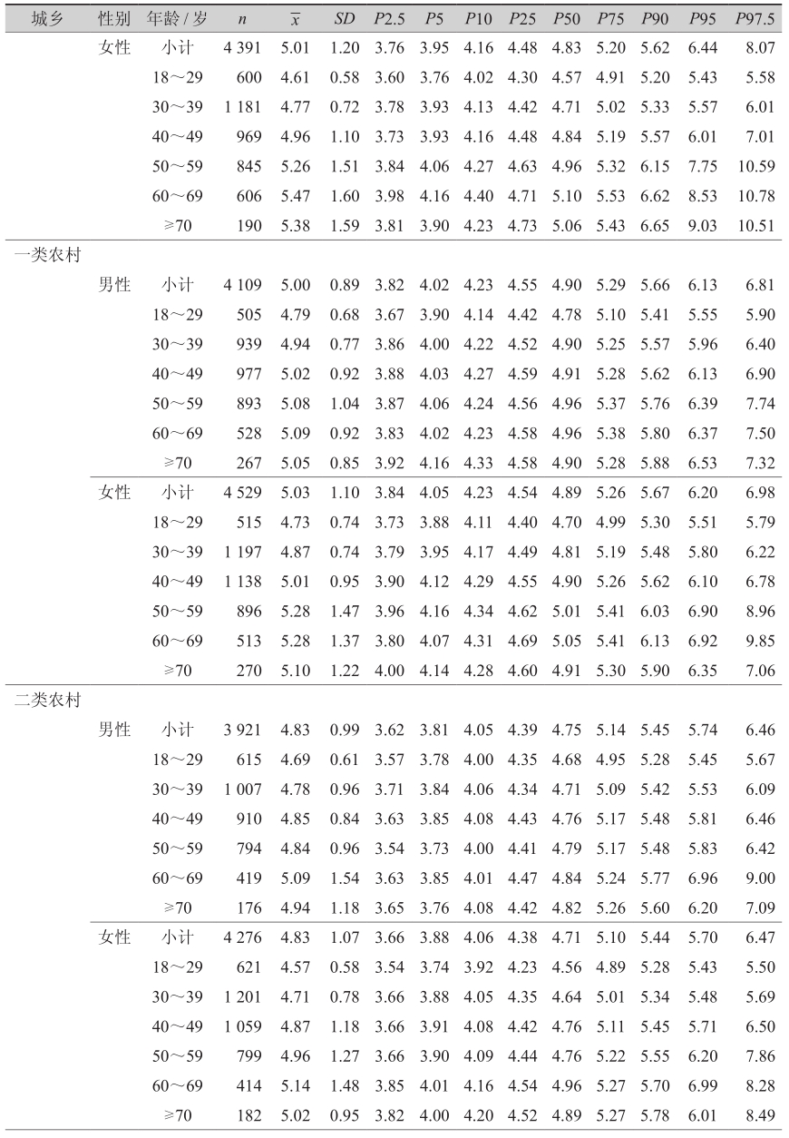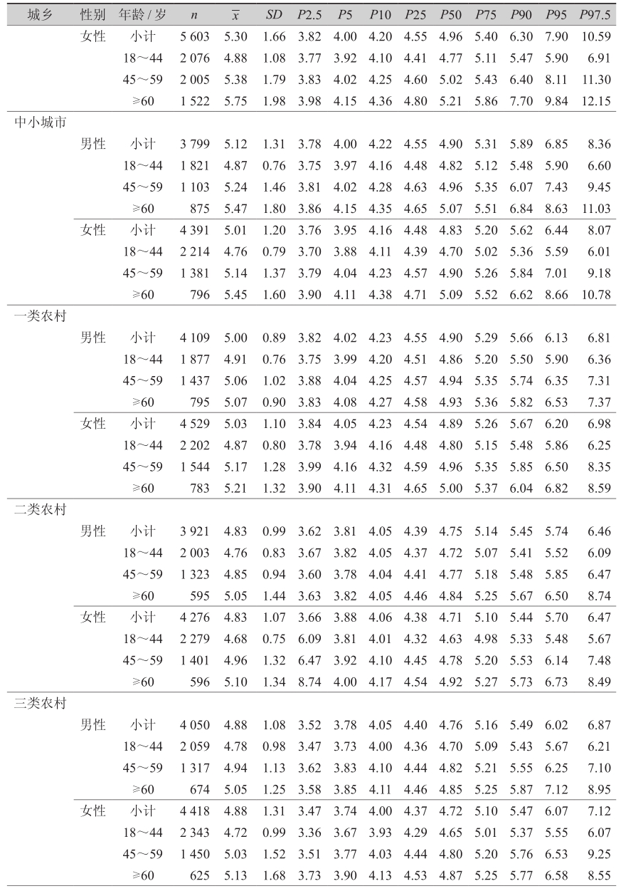 大城市男性和女性空腹血糖的中位数分别为5.02mmol/L和4.96mmol/L,中小城市男性和女性空腹血糖的中位数分别为4.90mmol/L和4.83mmol/L,一类农村男性和女性空腹血糖的中位数分别为4.90mmol/L和4.89mmol/L,二类农村男性和女性空腹血糖的中位数分别为4.75mmol/L和4.71mmol/L,三类农村男性和女性空腹血糖的中位数分别为4.76mmol/L和4.72mmol/L,四类农村男性和女性空腹血糖的中位数分别为4.59mmol/L和4.55mmol/L。大城市最高,然后依次为中小城市、一类农村、二类农村和三类农村,二类农村和三类农村水平相当,四类农村最低(表1-2-7、表1-2-8、表1-2-9和表1-2-10)。