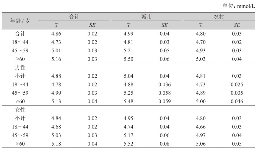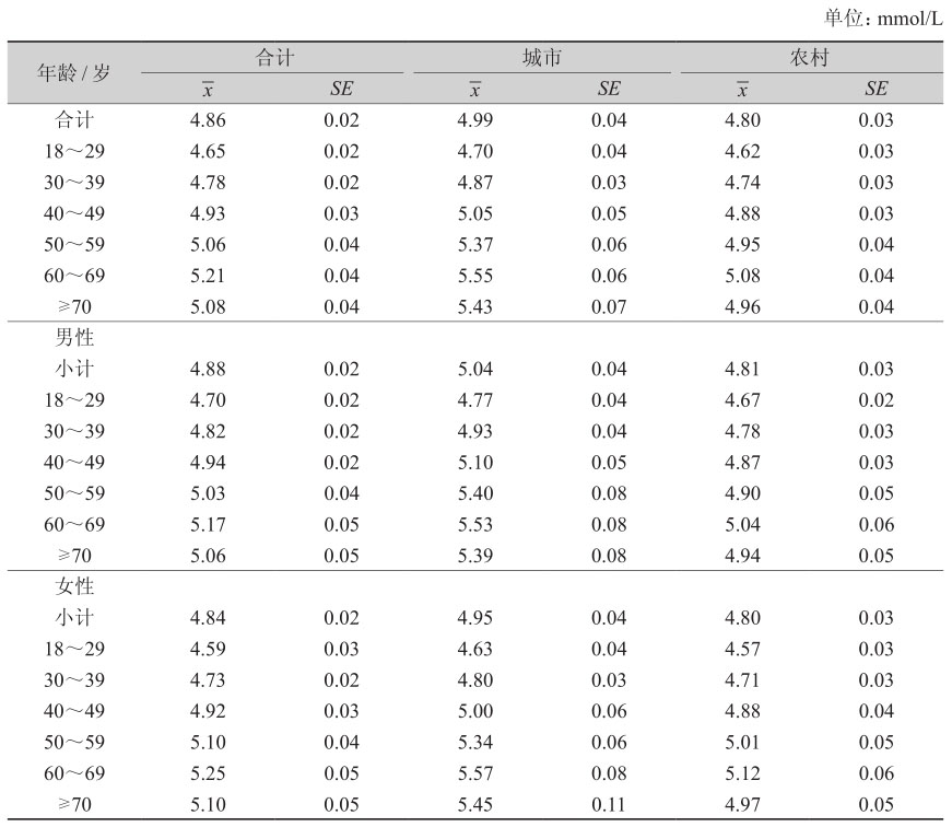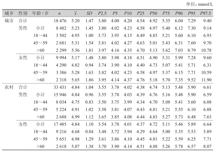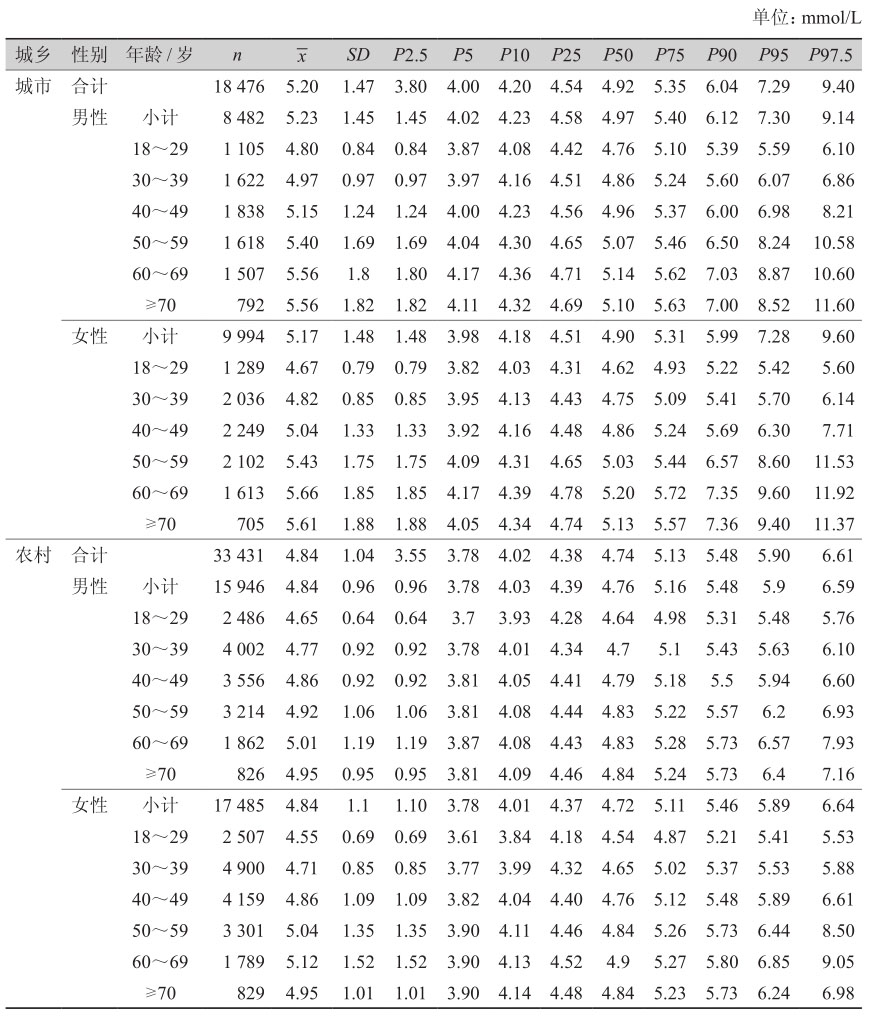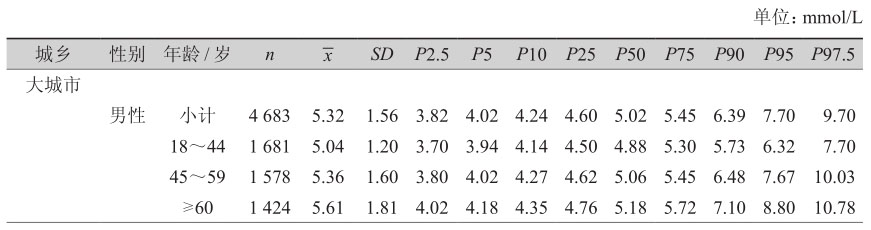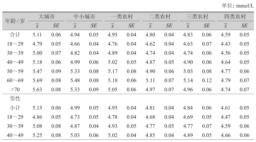 大城市男性和女性空腹血糖分别为5.15mmol/L和5.08mmol/L;中小城市男性和女性空腹血糖分别为4.99mmol/L和4.89mmol/L;一类农村男性和女性空腹血糖分别为4.95mmol/L和4.96mmol/L;二类农村男性和女性空腹血糖分别为4.81mmol/L和4.79mmol/L;三类农村男性和女性空腹血糖分别为4.84mmol/L和4.81mmol/L;四类农村男性和女性空腹血糖分别为4.61mmol/L和4.57mmol/L。大城市最高,中小城市和一类农村水平接近,二类农村和三类农村水平接近,四类农村最低(表1-2-13、表1-2-14)。