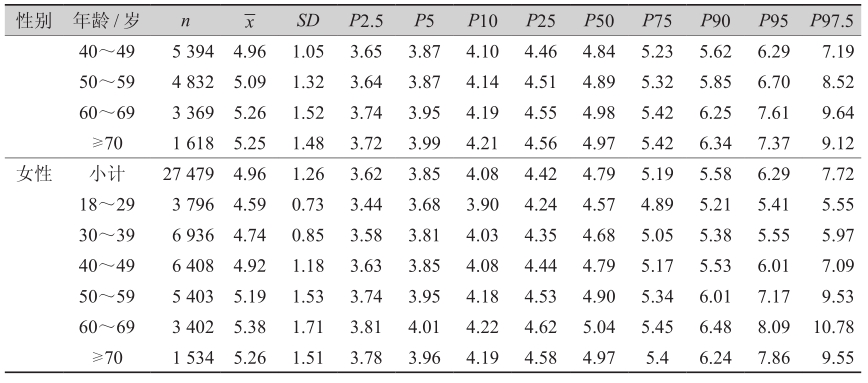 表1-2-5 2002年中国成年人空腹血糖百分位数分布
