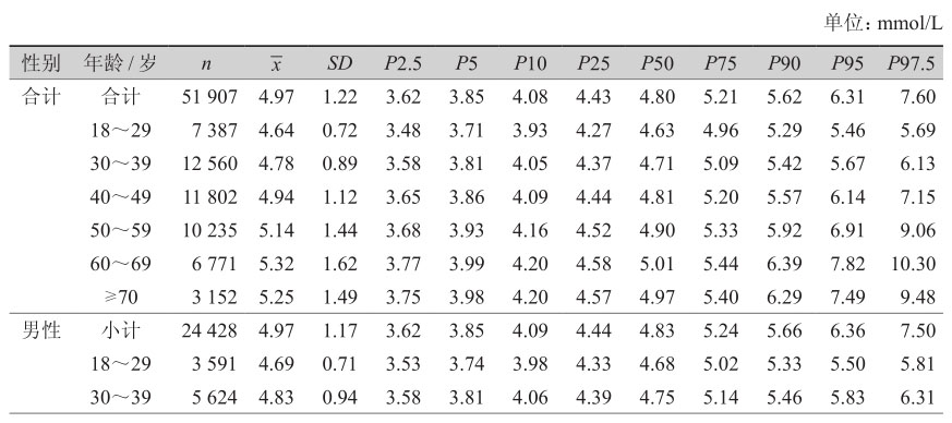 2002年,中国成年男性空腹血糖的中位数为4.83mmol/L,18~44岁、45~59岁和60岁及以上男性的空腹血糖的中位数分别为4.74mmol/L、4.87mmol/L和4.97mmol/L。中国成年女性空腹血糖的中位数为4.79mmol/L,18~44岁、45~59岁和≥60岁女性的空腹血糖的中位数分别为4.67mmol/L、4.87mmol/L和5.01mmol/L,成年男性和女性空腹血糖均随年龄增长而上升。城市男性和女性空腹血糖的中位数分别为4.97mmol/L和4.90mmol/L,农村男性和女性空腹血糖的中位数分别为4.76mmol/L和4.72mmol/L,城市成年人空腹血糖中位数均高于农村(表1-2-5、表1-2-6和表1-2-7)。