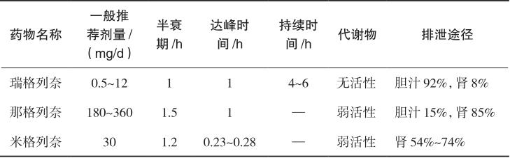 格列奈类促泌剂包括瑞格列奈、那格列奈和米格列奈,其作用特点如表2-3所示。此类药物口服吸收迅速,达峰时间<1小时,不同格列奈类药物的吸收速率和生物利用度受食物的影响程度不同。瑞格列奈的吸收受食物影响较小;那格列奈在肠道内通过那格列奈/H + 共同转运系统快速吸收,其吸收在肠道转运受饮食影响,餐前服药比餐后服药产生的血药浓度峰值高,吸收迅速而完全;米格列奈餐前5分钟内服用,给药后0.23~0.28小时达到最高血药浓度,半衰期约为1.2小时。格列奈类药物大部分与血浆蛋白结合,蛋白结合率为97%~99%。瑞格列奈和那格列奈的代谢主要通过有机阴离子转运多肽OATP1B1转运和肝微粒体细胞色素P450同工酶系统完成生物转化,肝细胞色素P450是体内参与药物代谢的重要酶系,其活性受到诱导或抑制后将干扰药物的作用。因此,瑞格列奈和那格列奈与多种药物存在相互作用。米格列奈经UGT1A9和UGT1A3代谢,极少量经CYP2C9代谢。瑞格列奈及其代谢物92%通过胆汁排泄,8%经尿排泄,可用于肾功能不全患者。
