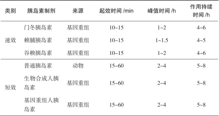 包括普通胰岛素、生物合成人胰岛素和基因重组人胰岛素。常用的生物合成人胰岛素制剂有诺和灵R(Novolin R);基因重组人胰岛素制剂有优泌林R(Humulin R)、甘舒霖R及重和林R等。此类胰岛素为无色透明液体,可供皮下注射或静脉注射。皮下注射后0.5~1小时开始起效,2~4小时达到作用高峰,作用持续5~8小时。