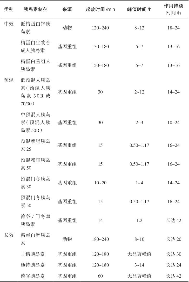 根据作用持续时间,胰岛素可分为速效(超短效)、短效、中效和长效胰岛素,另可将短效和中效胰岛素按不同比例预先混合制成预混胰岛素。临床上常用的胰岛素制剂及作用特点如表2-1所示。