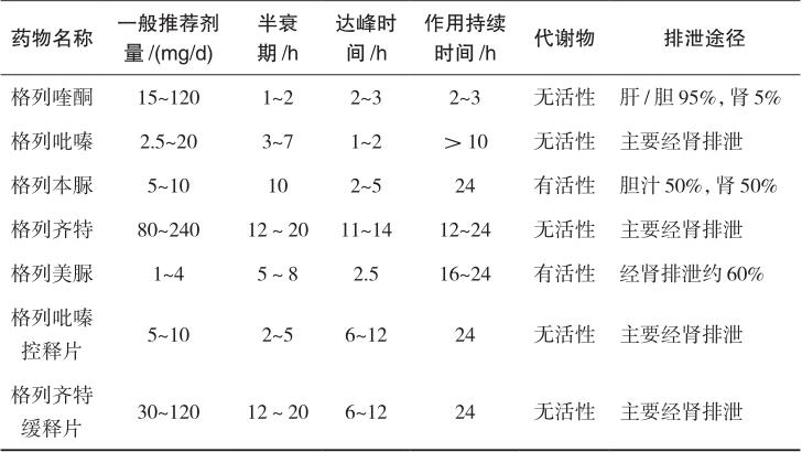 不同磺酰脲类药物的药效学和药动学存在较大的差异,表2-2中列出常用磺酰脲类药物品种和剂型的作用特点。根据作用时间,分为短效制剂和中、长效制剂。短效制剂的半衰期短,作用迅速,主要用于控制2型糖尿病的餐后血糖,包括格列喹酮、格列吡嗪等。格列喹酮的大部分代谢产物由胆汁入肠道,仅5%经肾脏排泄,可用于轻至中度肾功能不全者。中、长效制剂的半衰期长,作用较持久,用于控制2型糖尿病患者的空腹血糖和餐后血糖,包括自身半衰期较长的普通剂型如格列本脲和格列美脲,以及剂型改良之后的缓控释制剂,如格列齐特缓释片和格列吡嗪控释片。格列齐特缓释片采用以亲水性羟丙甲纤维素为基质的缓释技术,格列吡嗪控释片通过胃肠道治疗系统(GITS)技术实现控释,保证全天血药浓度平稳,更符合2型糖尿病24小时基础血糖的控制要求,较少引起低血糖。