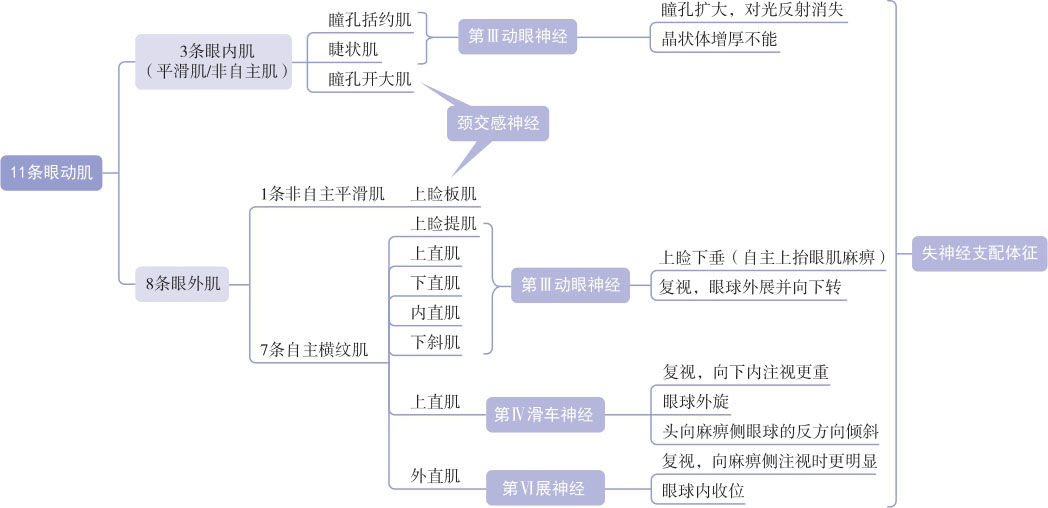 动眼神经麻痹——其支配的眼外肌麻痹表现为上睑下垂、外斜视,眼球不能向上、向内及向下运动或受限,并出现复视;眼内肌麻痹表现瞳孔散大、光反射及调节反射消失。
