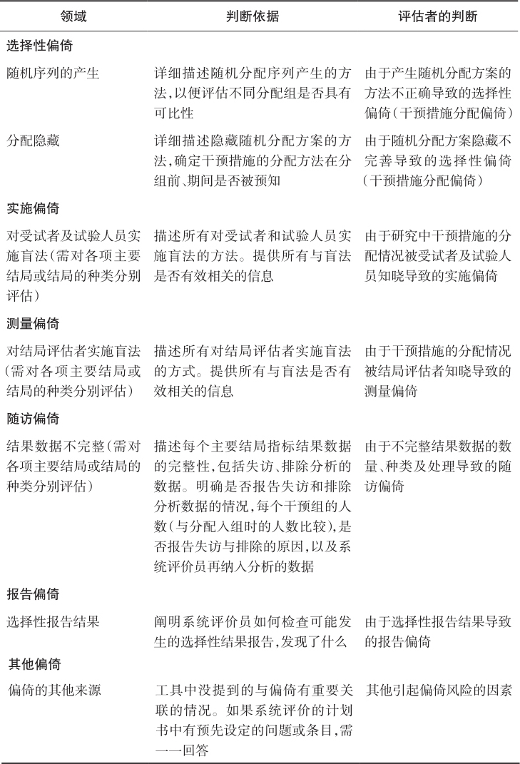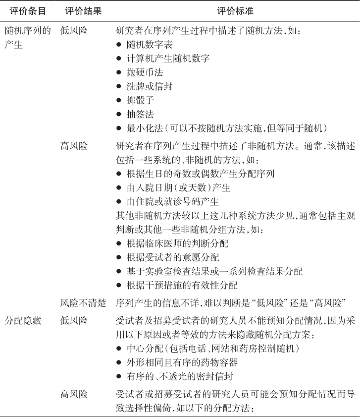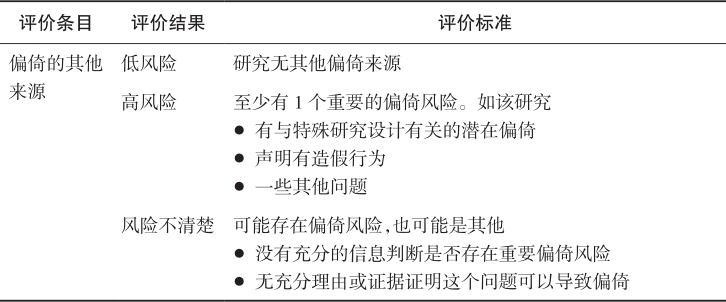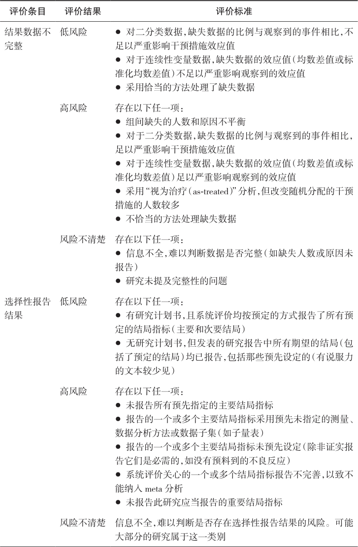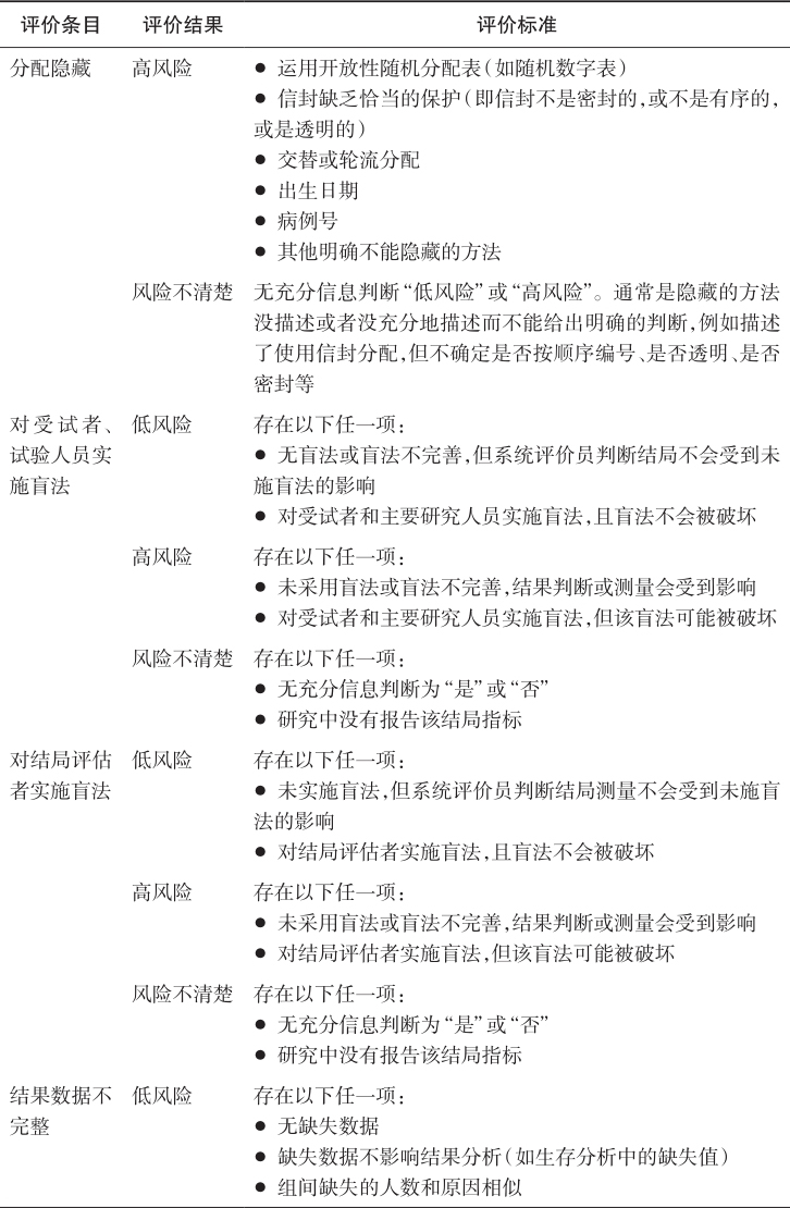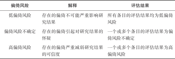 表10-5 Cochrane偏倚风险评估工具的偏倚风险评价标准
