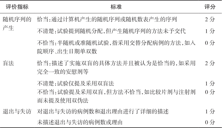临床试验的偏倚评价包含2个方面的内容:一是外部真实性,指研究结果是否可以应用于研究对象以外的其他人群,即结果的实用价值与推广应用情况,主要与研究对象的特征、研究措施的实施方法和结果的选择密切相关;二是内部真实性,指单个研究结果接近真实值的程度,即受各种偏倚因素的影响情况。内部真实性评价通常描述为“方法学质量评价”或“质量评价”,但Cochrane系统评价手册认为“研究质量”和“研究偏倚”是有区别的,“偏倚”更能真实地反映研究存在的缺陷。本节将对随机对照试验常用的方法学质量评价工具Jadad量表和Cochrane偏倚风险评估工具进行简单介绍。