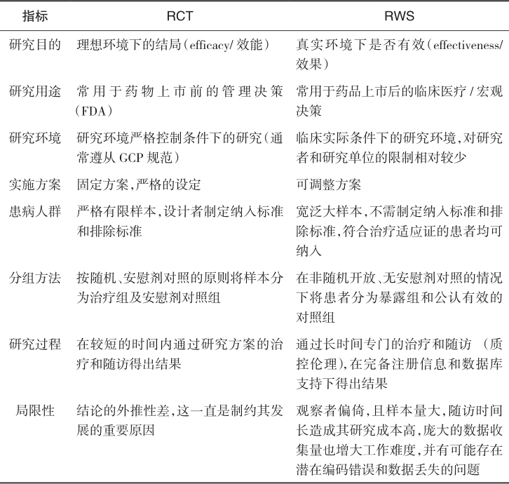 随机对照试验关注效力研究(efficacy trials),即药物与干预措施能否在理想、严格控制的环境下产生预期的效果,着重于内部有效性,不易普遍化。真实世界研究关注效果研究(effectiveness trials),即评价药物在真实临床环境下的治疗效果,重在外部有效性。在具体的设计和各自的局限性上,RCT和RWS有很大的差别(表14-1)。