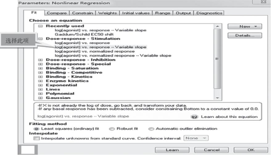 (5)曲线拟合及EC 50 的计算:单击“分析工具栏(Analyses)”中的曲线拟合工具,选择“Dose-response-Stimulation”项下的“log〔agonist〕vs.response-variable slope”,单击“OK”确认。Results 下即可获得最大值(Top)、logEC 50 及EC 50 的均值及标准误(图3-3)。
