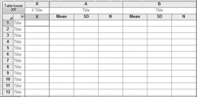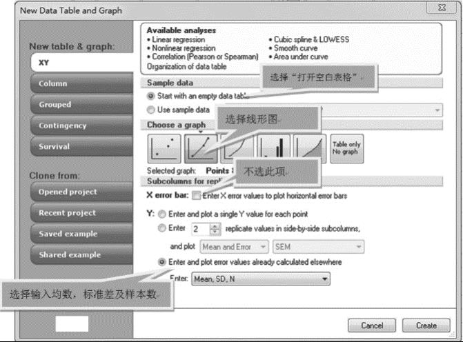 (3)“重复与误差值数据列(Subcolumns for replicates or error values)”设置为“X error bar”为不选择;Y 选项下选择“Enter and plot error values already calculated elsewhere”,并在Enter 中选“Mean,SD,N”表示以均值和标准差作图。单击“新建(Create)”按钮即可出现新的数据输入表格(注:Y 选项第2 项为输入原始数值。两种方式均可)。