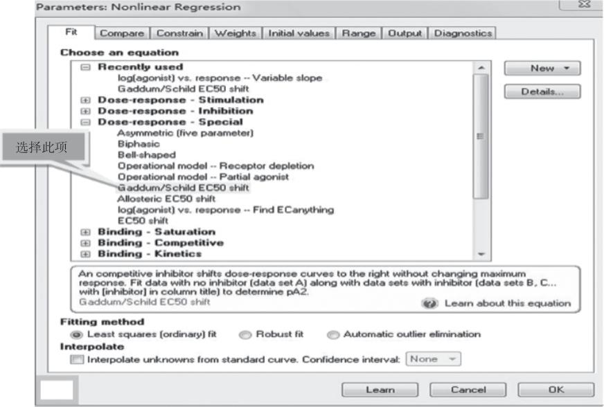 (6)拮抗参数(p K B )的计算:单击“分析工具栏(Analyses)”中的曲线拟合工具,选择“Dose-response-Special”项下的“Gaddum/Schild EC50 shift”,读取结果中的pA 2 值即可(图3-4)。
