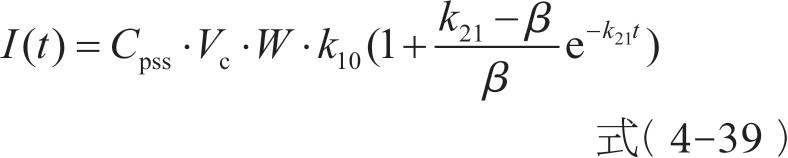 当 t →∞时,药物在体内的分布达到稳态,房室之间的转运速率为0,输注速率恒定为药物的消除速率 E 。中央室的表观分布容积 V c 通常以L/kg 为单位,具体计算时应乘以相应的体重。