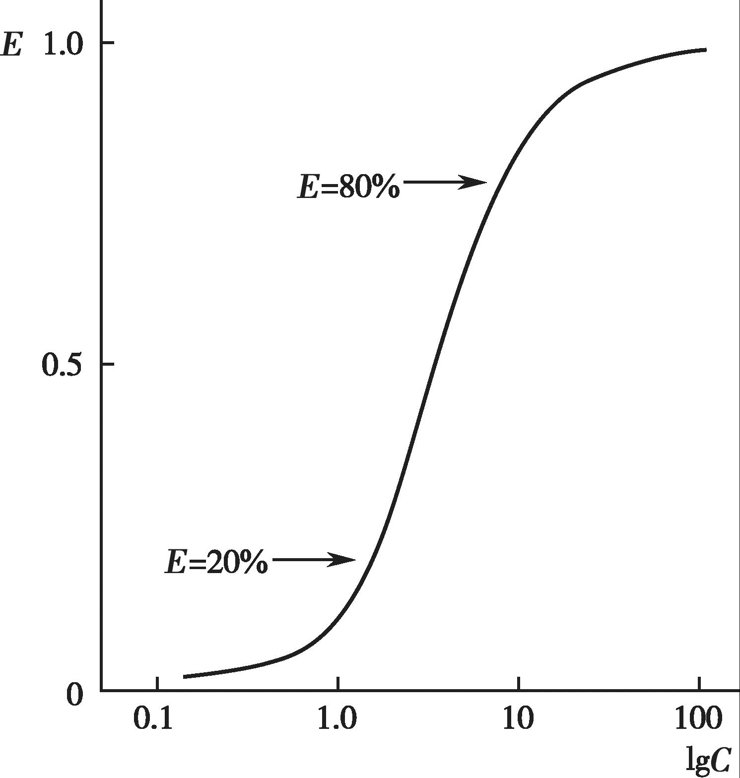 有些药物的血药浓度和药理效应呈一定的线性关系,即随着血药浓度的增加,药效也逐渐增强,最终达到一个最大值(图4-11);以药效对血药浓度的对数作图,可得到一个S 形曲线或者抛物线(图4-12)。许多药物的治疗浓度范围通常落在其药理效应强度达到20%~80%所对应的血药浓度范围内,这时的药理效应强度和血药浓度的对数呈现良好的线性关系。