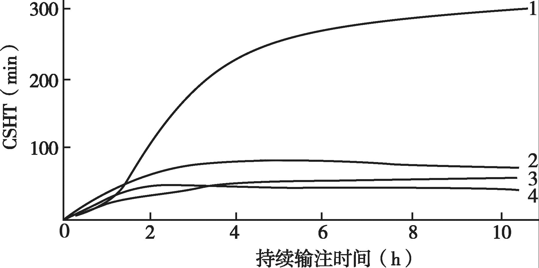 图4-20 血浆浓度下降50%需要的时间与输注时间的关系