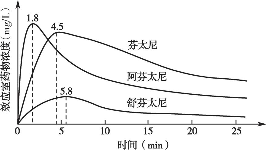 图4-19 等效剂量的芬太尼类药物单次注射后效应室浓度达峰时间的差异