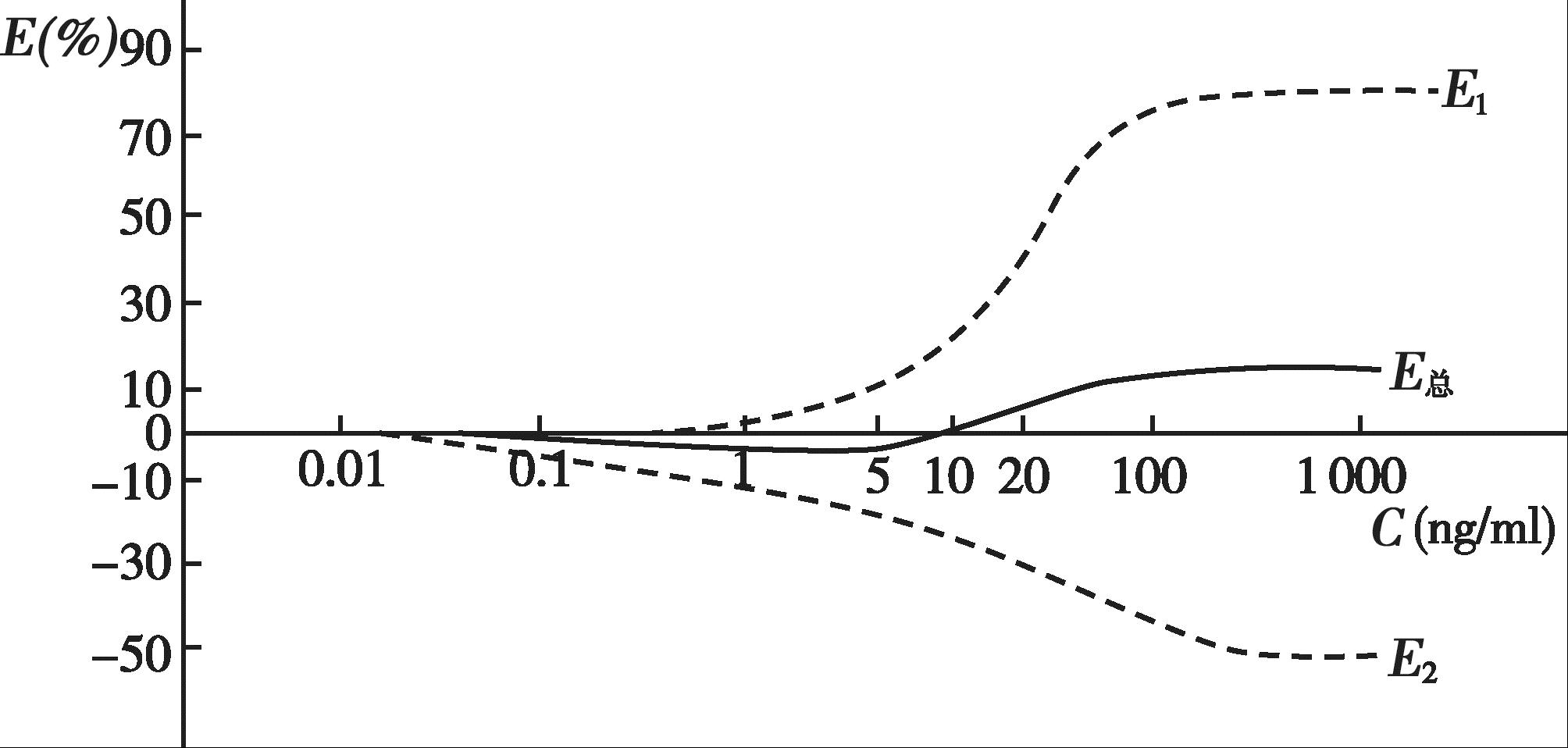 用血压的变化(mmHg)表示药理效应( E ),见图4-15。由图4-15 可知,血药浓度在0.5ng/ml 以下时只有降压效应( E 2 );当血药浓度>0.5ng/ml 时开始出现升压效应( E 1 ),但总体药效仍表现为血压下降;当血药浓度达到大约10ng/ml 时,升压效应和降压效应相等,即 E 1 + E 2 =0,总体药效表现为无效应;而当血药浓度>10ng/ml 时, E 1 > E 2 ,总体药效表现为血压升高。临床上应用可乐定时,应控制给药剂量,使血药浓度不要高于5ng/ml,以免产生升压作用。