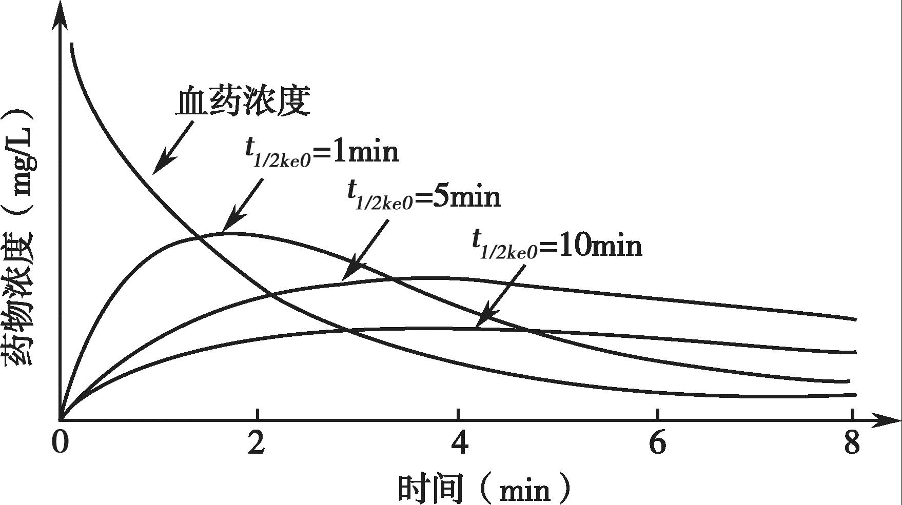 药物进入效应室属一级动力学过程,可用一级速率常数 k e0 表示。在血浆浓度恒定的情况下,效应室药物浓度达效应室药物浓度最大值的50%所需要的时间 t 1/2 k e0 =ln2/ k e0 , k e0 越大, t 1/2 k e0 越小,药物峰效应滞后现象越不明显;反之亦然。