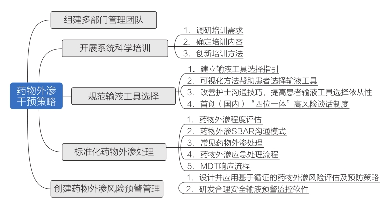 我们以降低药物外渗作为持续改进项目,以控制药物外渗发生率≤0.20%,药物外渗中重度伤害发生率≤0.10%为改进目标,并通过运用思维导图(图1)设计药物外渗系统化干预策略,并严格落实,包括:组建多部门管理团队、开展系统科学培训、规范输液工具选择、标准化药物外渗处理、药物外渗风险预警管理。