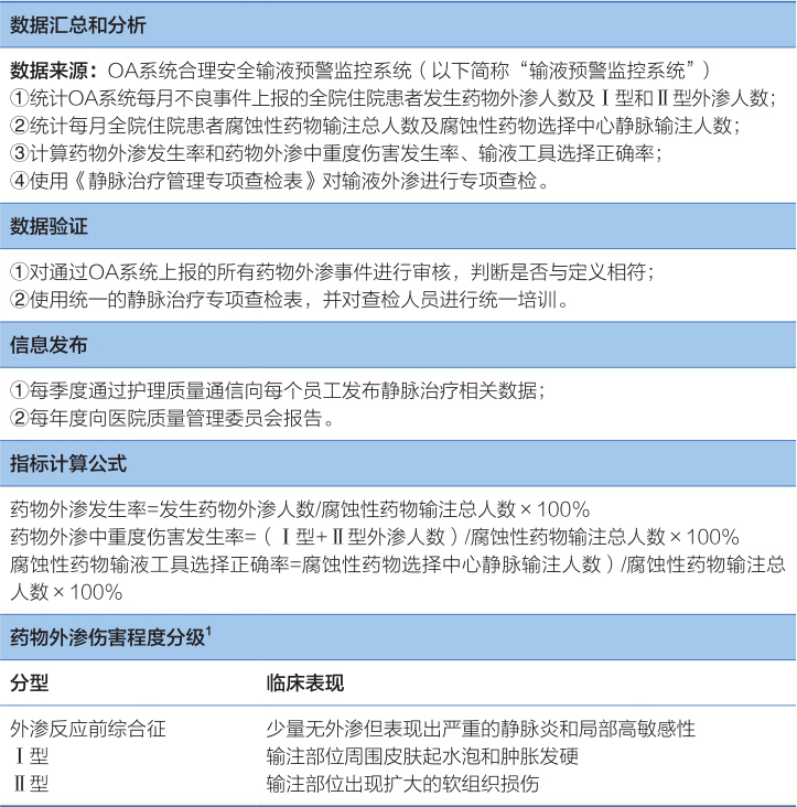 为了监控标准执行过程,通过查阅国内外文献、专家函询及本院药物外渗不良事件上报情况,我们确定了药物外渗发生率、药物外渗中重度伤害发生率作为静脉治疗质量监控指标,并建立了相关指标说明书;定义外渗发生率、外渗中重度伤害发生率、明确了纳入和排除标准、数据收集方法、数据汇总、分析及验证、信息发布、指标的目标/阈值、指标计算公式、药物外渗伤害程度分级(表1)。