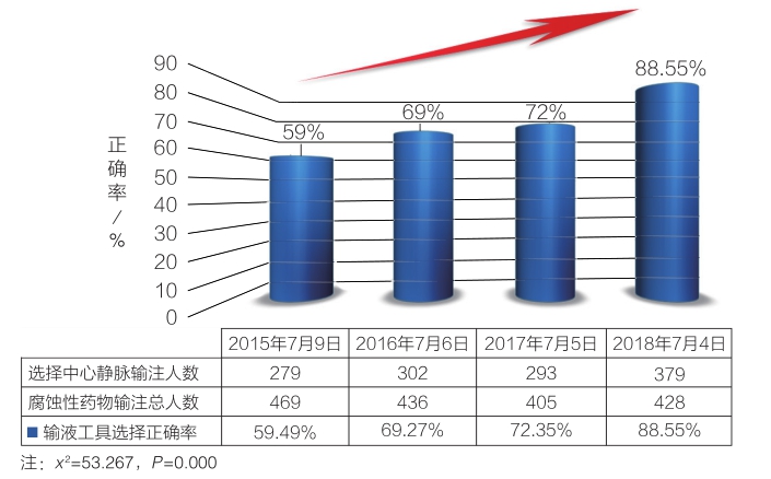 针对以上原因,我们采取了以下整改措施:①在药学部的协助下,对药物性质进行分类;明确高危外渗药物的种类,并建立全院高危外渗药物输液工具指引及专科特色的高危外渗药物输液工具指引。②对患者和家属采用图文并茂的宣教单、宣教视频,动态指引图等可视化方法,帮助患者或家属认识正确选择输液工具的重要性。③对护士采取多形式的沟通培训,如护患沟通情景模拟培训、静脉治疗规范辩论赛、PICC健康教育大赛;并推行以Teach-back(回授法)的健康教育方法宣讲外渗发生原因及后果,指导患者正确选择输液工具及置管后正确维护,获取患者反馈;环环相扣,改善护士沟通技巧,提高护士宣教能力。④针对病情严重、置管困难及置管高并发症风险等特殊病例,在国内首创由静疗专家、律师、医生、患者或家属组成的“四位一体”高风险谈话,并形成医院文件和常规制度,提高了患者对药物外渗风险的理解力。通过一系列的努力,2015—2018年全院腐蚀性药物输液工具选择正确率,连续四年稳步提升,从59.49%提升到88.55%(图3)。
