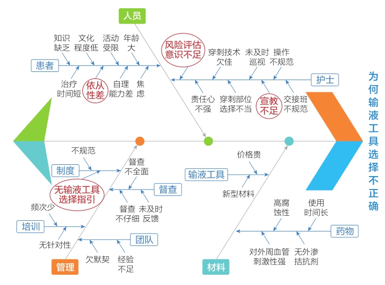 输液工具选择不正确带来的最直接后果就是药物外渗,而我院现状调查结果显示,全院69个护理单元腐蚀性药物输液工具选择正确率均值不到60%。同期,某科室有一位慢性肾功能衰竭的患者,由于骨代谢异常需要输注腐蚀性药物——葡萄糖酸钙,由于家属拒绝中心静脉置管,在必须要保留未来动静脉瘘的情况下,护士无奈选择右下肢留置针输液。但刚输液不久,发生了药物外渗!针对该典型案例,我们进行根因分析,绘制鱼骨图(图2)。分别对人员、管理、材料三个维度,患者、护士、制度、督查、培训、团队、输液工具、药物8个方面进行深入剖析,发现没有正确选择输液工具的主要原因是①护士的风险评估意识不足;②宣教不充分;③患者/家属依从性差;④管理上缺乏可操作的输液工具选择指引。