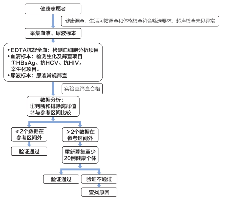 临床实验室在参考区间使用前应对其进行验证,验证时采用实验室正在使用的检测系统。验证结果符合要求后可直接使用,不符合要求则应从分析质量和人群差异等方面查找原因。