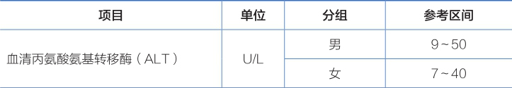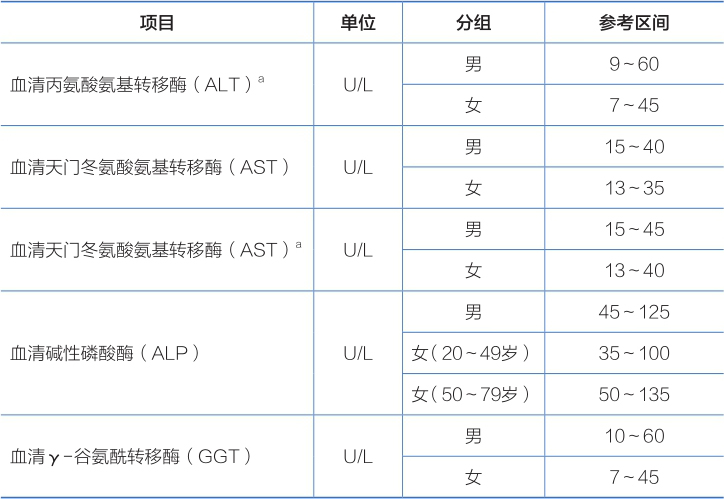 对于ALT和AST检测,IFCC推荐含5’-磷酸吡哆醛分析试剂,然而我国绝大多数实验室使用不含5’-磷酸吡哆醛试剂,需注意本实验室的检测方法;ALP参考区间按性别、年龄提供。
